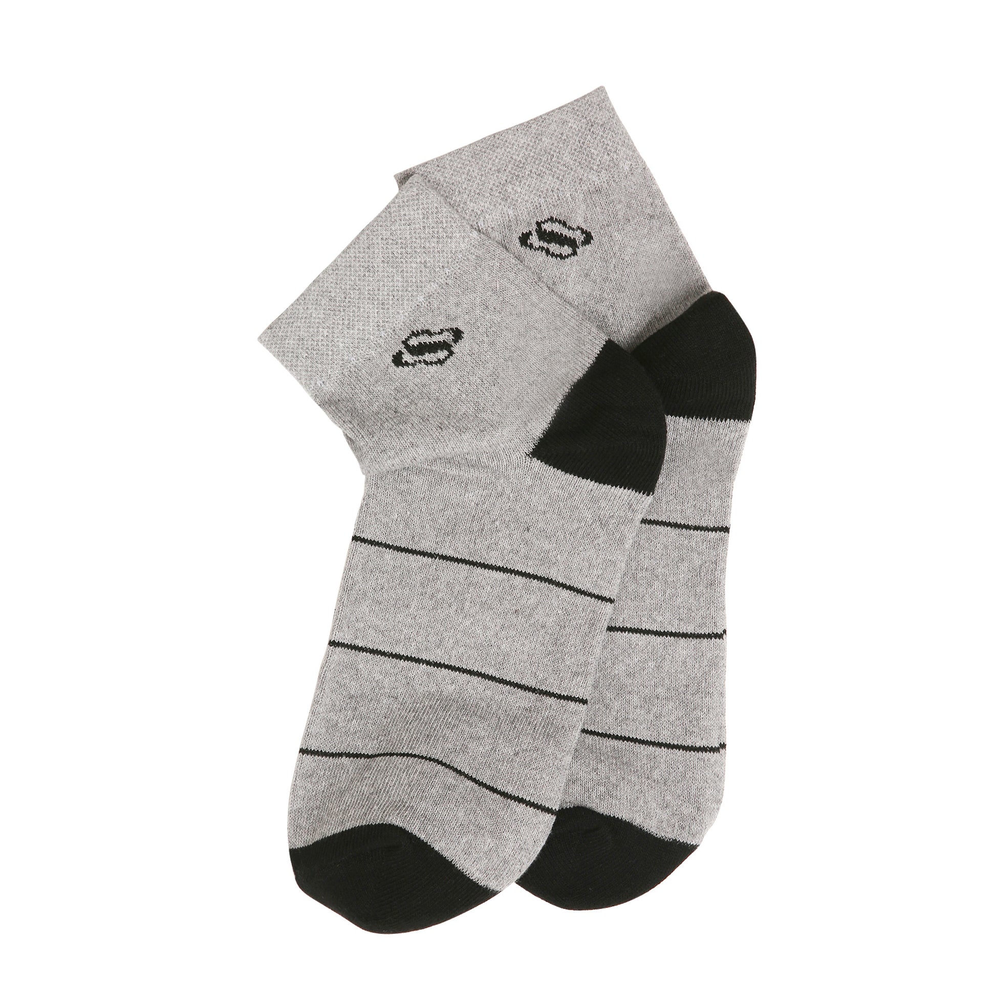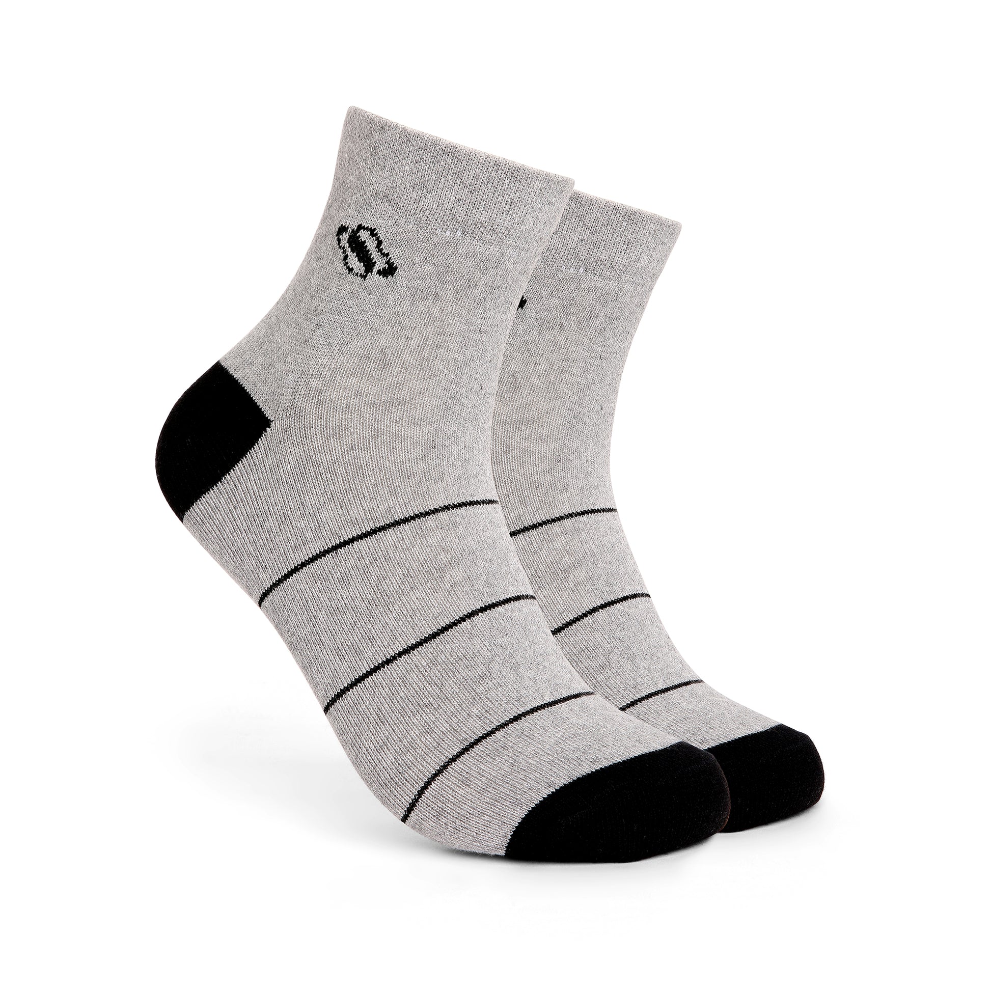 Comfort-driven grey crew socks with reinforced black heel and toe panels, designed for long hours of everyday use.